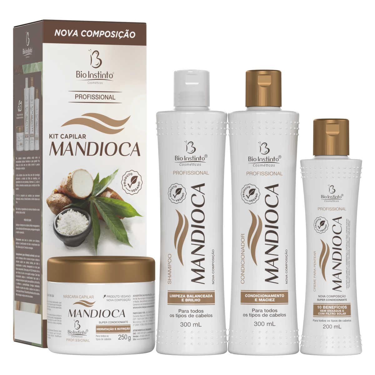 COMPOSIÇÃO (PORTUGUÊS): Água, Butil-Hidroxitolueno, Álcool Cetearílico, Cloreto de Cetrimônio, Álcool Cetílico, Ácido Cítrico, Edetato Dissódico, Dimetilidantoína, Octinoxato, Extrato da Folha de Mandioca, Parafina Líquida, Perfume, Peg-90M, Poliquatérnio-7, Fenoxietanol, Alfa-Isometil Ionona, Salicilato de Benzila, Cumarina, Geraniol, Hexil Cinamal, Hidroxicitronelal, Limoneno, Linalol.